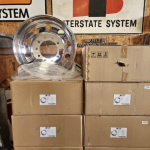 Brand new polished aluminum 24.5 truck wheels — perfect for Peterbilt or any semi truck. Clean round hole design with a mirror polish that looks amazing on the road.
